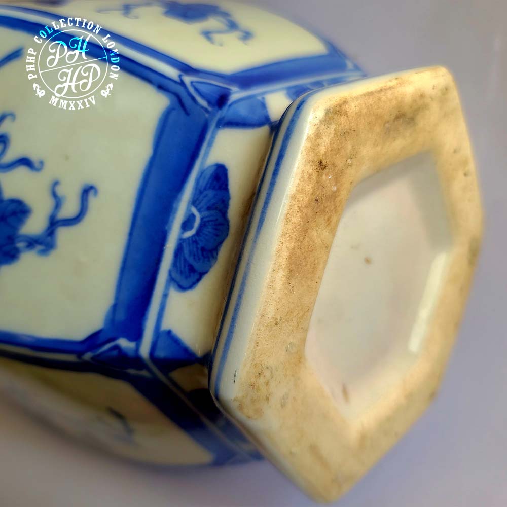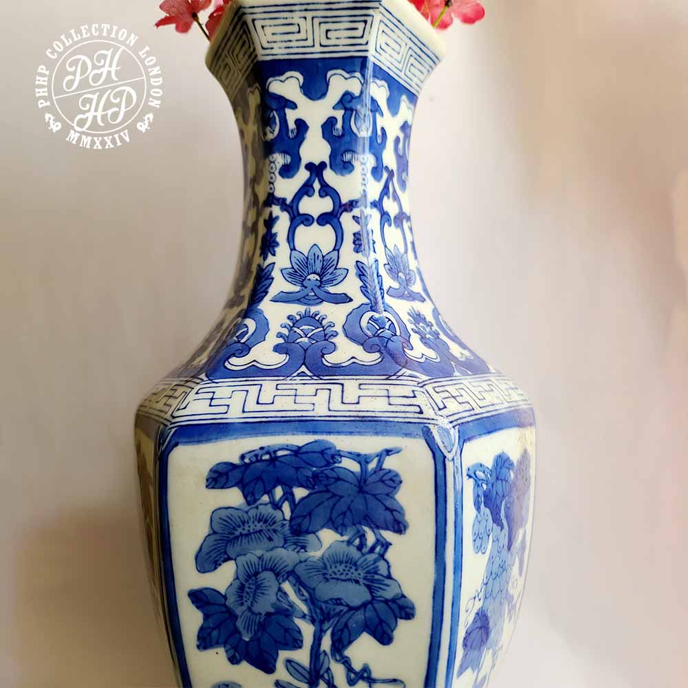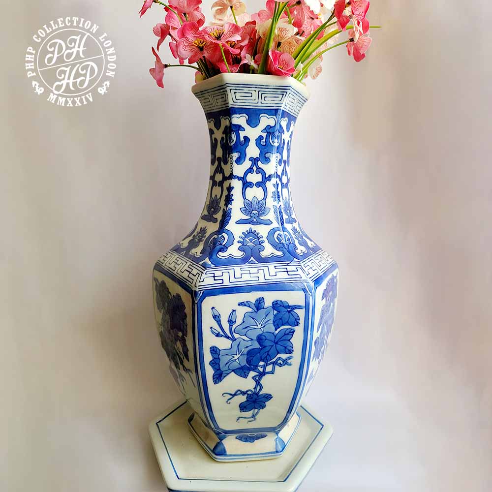 A distinctly high quality flower vase in cobalt blue & white in underglaze porcelain. This vase shows the finest quality porcelain production of Ming Dynasty diplomatic or export quality porcelain production. The floral gapes on vines shows not only the quality of cobalt painting and craftsmanship of the maker, this vase could be the highly sought after blue and white porcelain flower vase. It is large in size, whilst the condition is excellent. Truly desired master piece flower vase and is ideal for the museums or private collector from around the world. This is flower has an exceptional story of re-union with the hexagonal porcelain base of the similar time period, found and collected from two different places at entirely different context. We are proud to have discovered the matching hexagonal base with this flower vase. Truly remarkable!