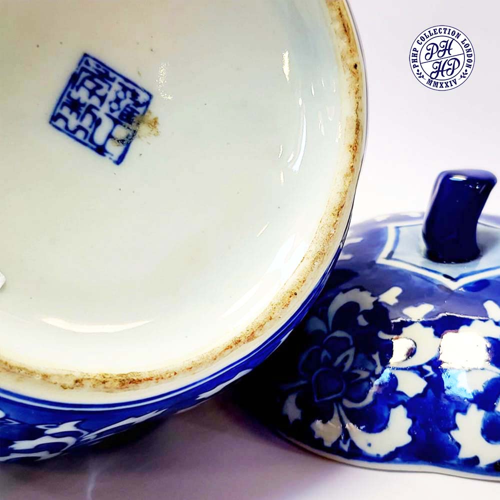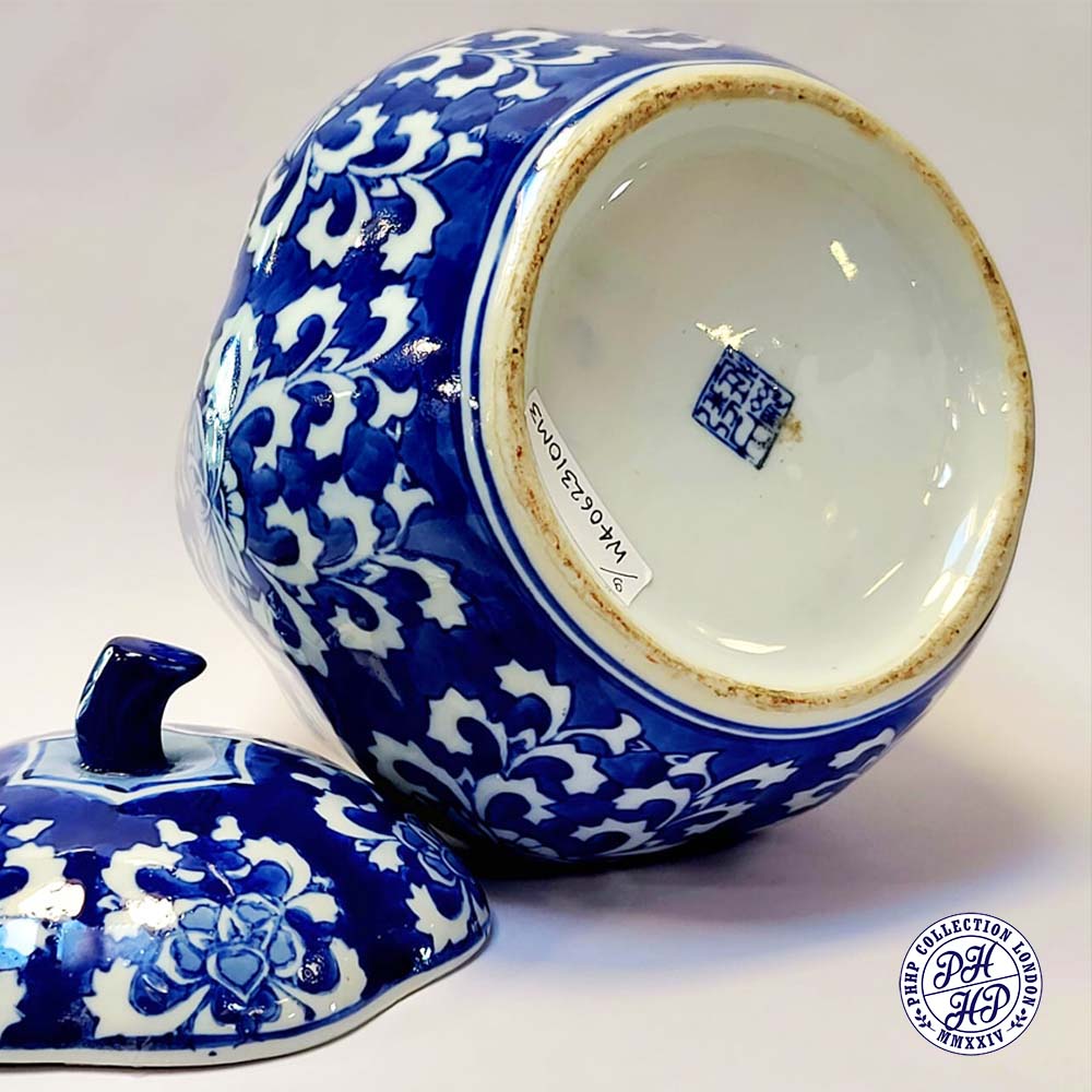 This piece of porcelain is considered to be an art deco less aggressive or political floral ornamental jar gifted to display peaceful bilateral relationship expectations by the high ranking diplomatic official to his counterpart visiting from Europe. The peony flowers blossoming amidst the lurking leaves in the iron rich deep dark blue cobalt still shows the painstaking task with a longer time to draw and paint before glazing.