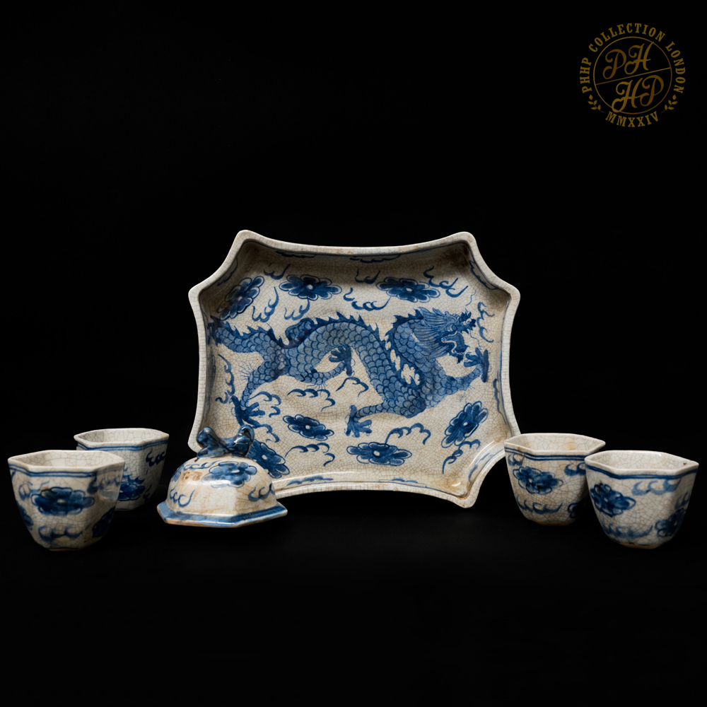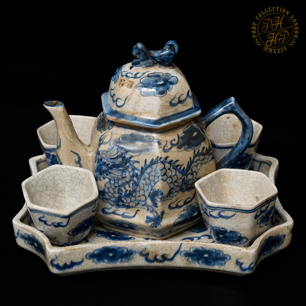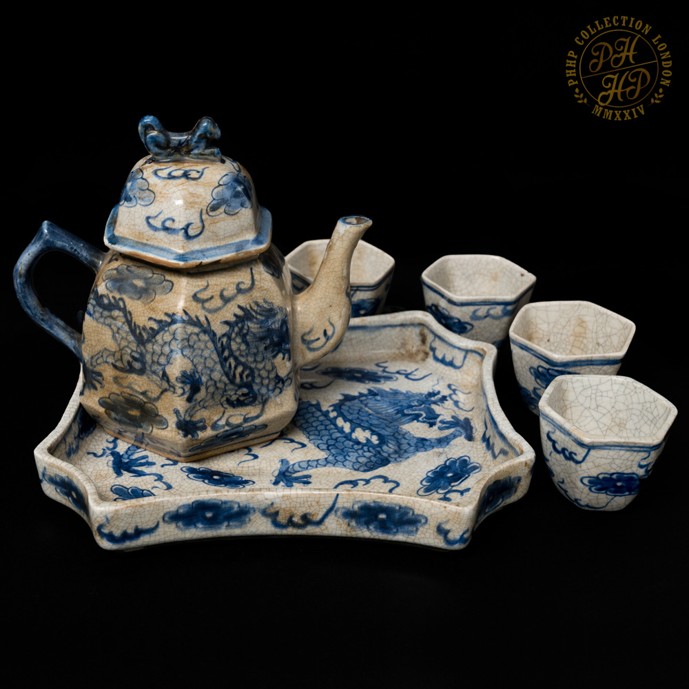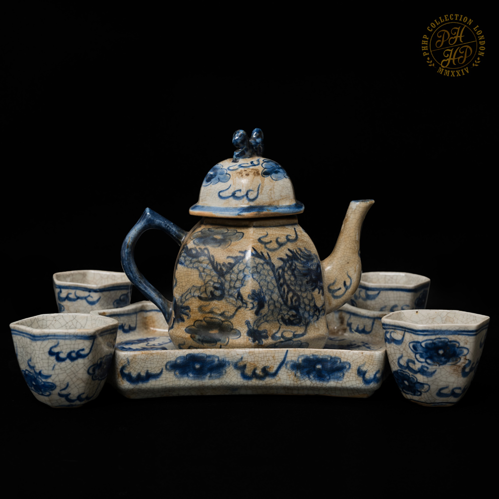These Blue & White in cobalt blue underglaze in crackled celadon features of porcelain tea pot set with tray is exceptionally rare and antique! The flying dragons in the cloud head from East to the West are hand painted. The similar works of arts are carried through the sexagonal facets. These porcelains are made not for day-to-day usage but for decorative purposes. The set are ideal piece for the private or institutional collectors, such as museums.