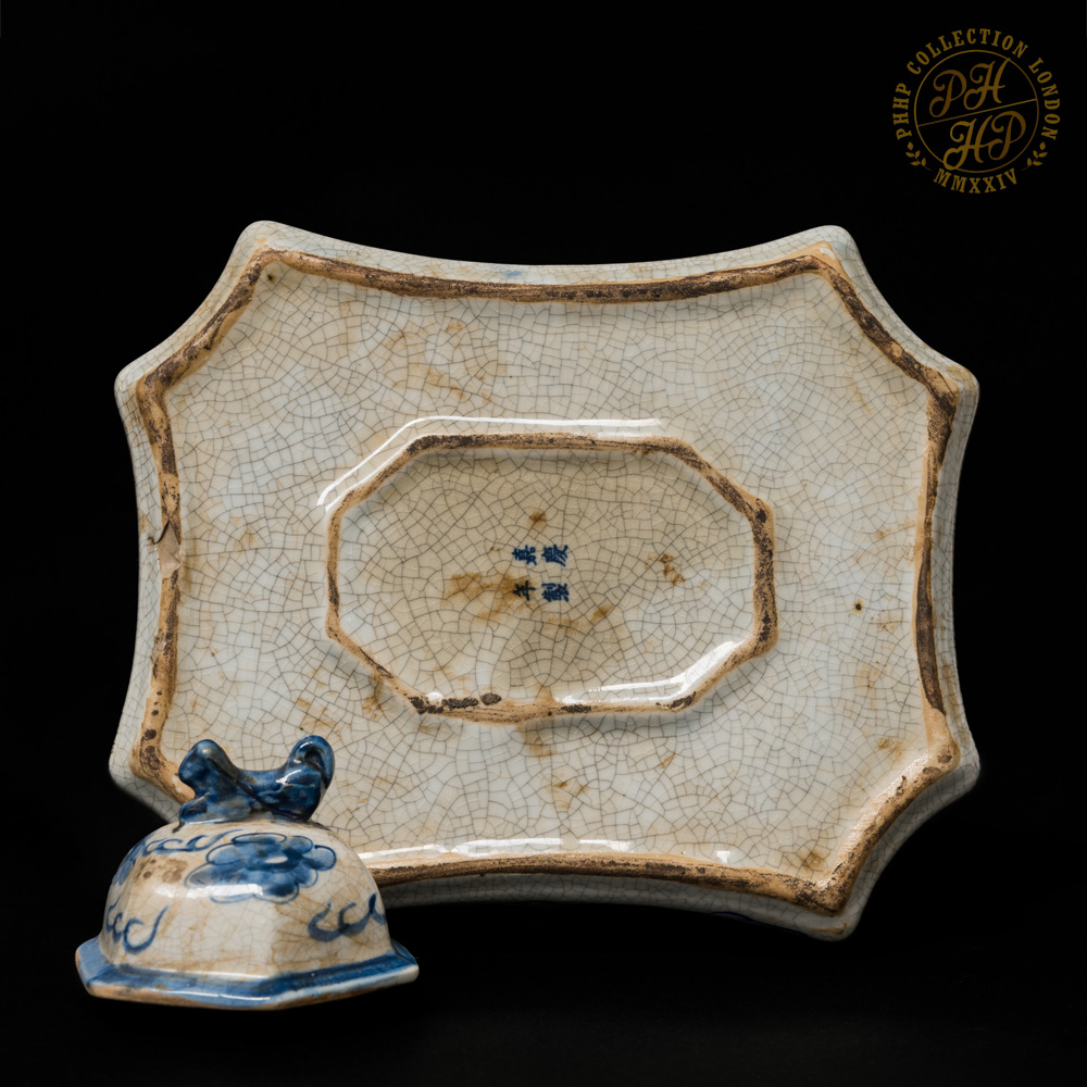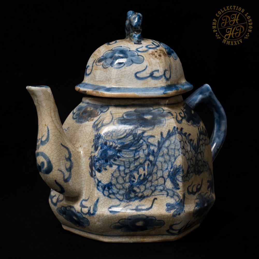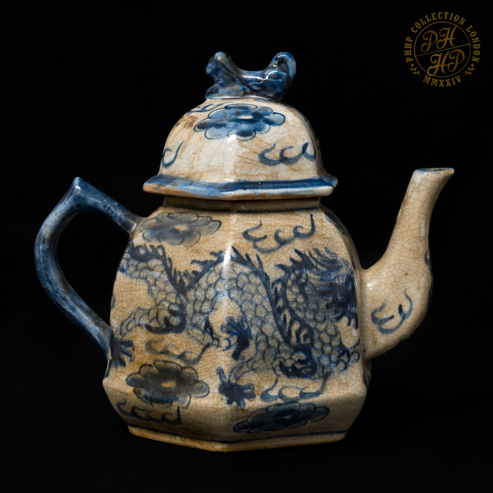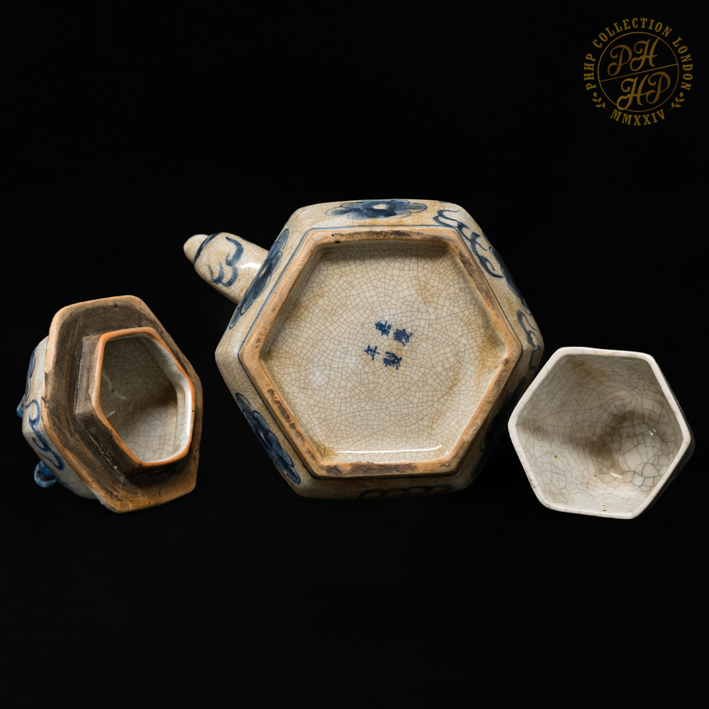 These Blue & White in cobalt blue underglaze in crackled celadon features of porcelain tea pot set with tray is exceptionally rare and antique! The flying dragons in the cloud head from East to the West are hand painted. The similar works of arts are carried through the sexagonal facets. These porcelains are made not for day-to-day usage but for decorative purposes. The set are ideal piece for the private or institutional collectors, such as museums.