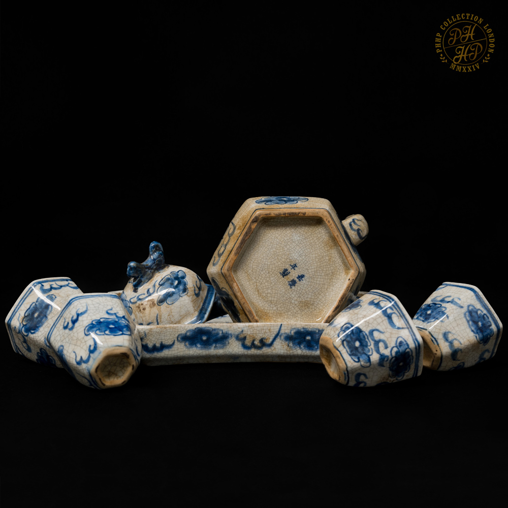 BLUE & WHITE CELADON PORCELAIN TEAPOT SET WITH SEXAGONAL CUPS