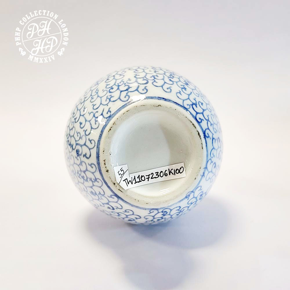 This beautiful art-deco vase is typical of Ming dynasty production of blue & white hand drawn cobalt blue underglaze porcelain. The drawings show the distinct features of peony on ornamental and yet auspicious drawings. Each line of drawings on brush to provide the meditative sensation depicting the essence of happiness and tranquility.