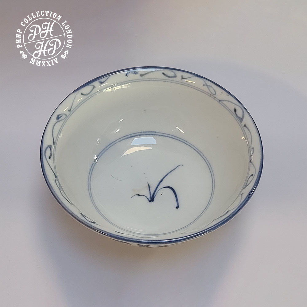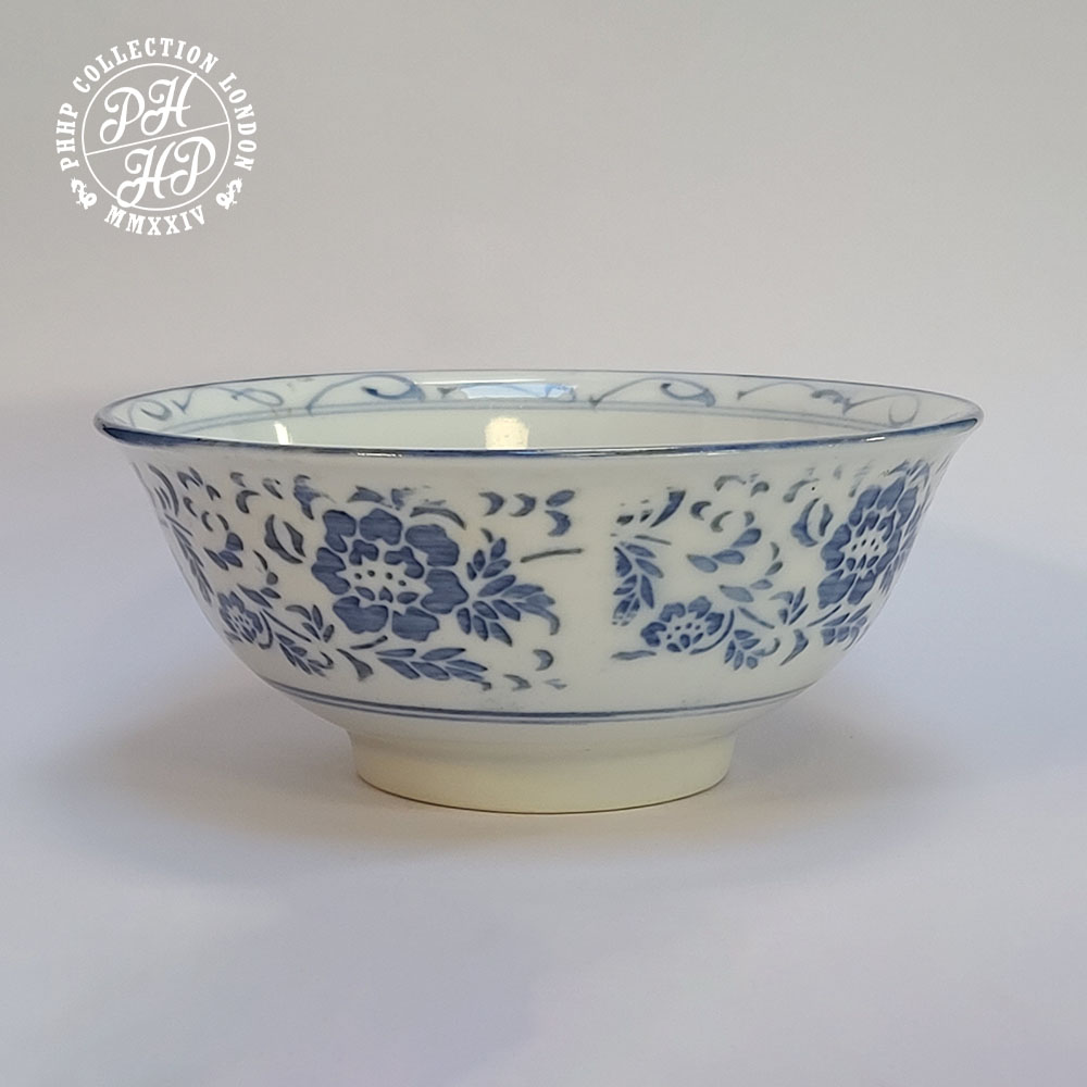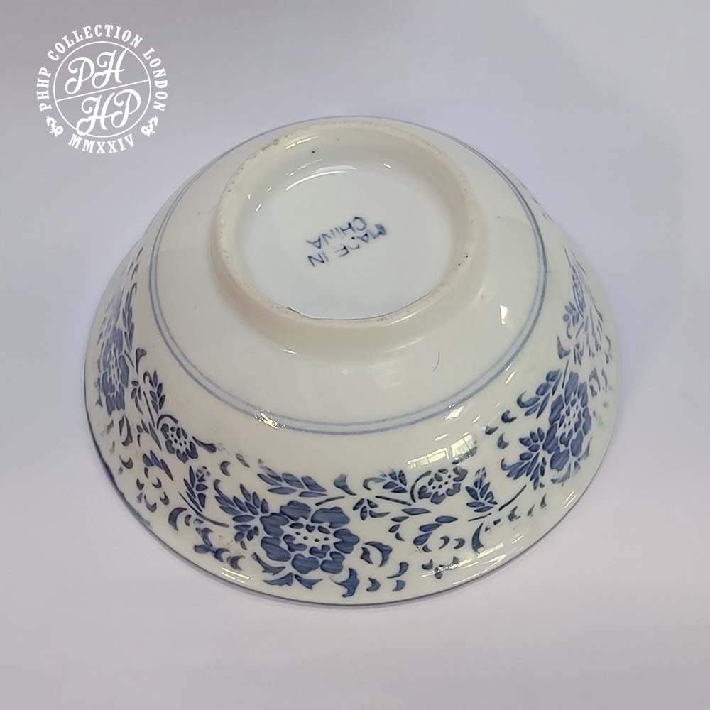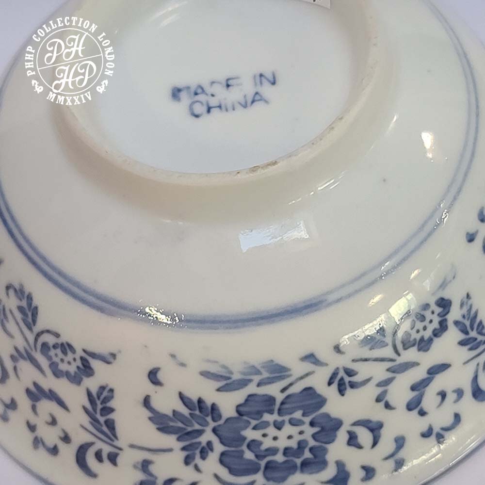 This is a rare porcelain bowl in Matt finish drawing of the peony flowers petals painted in underglaze blue & white scroll pattern. Large bowl, hand painted made for artistic purpose. Export purpose porcelain bowl. Early days of Made in China mark at the bottom. Truly collectible for collectors and museums.
