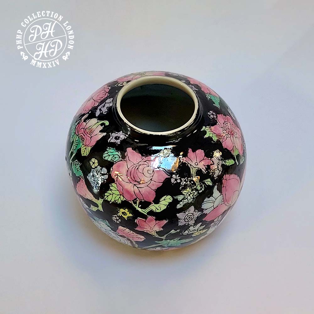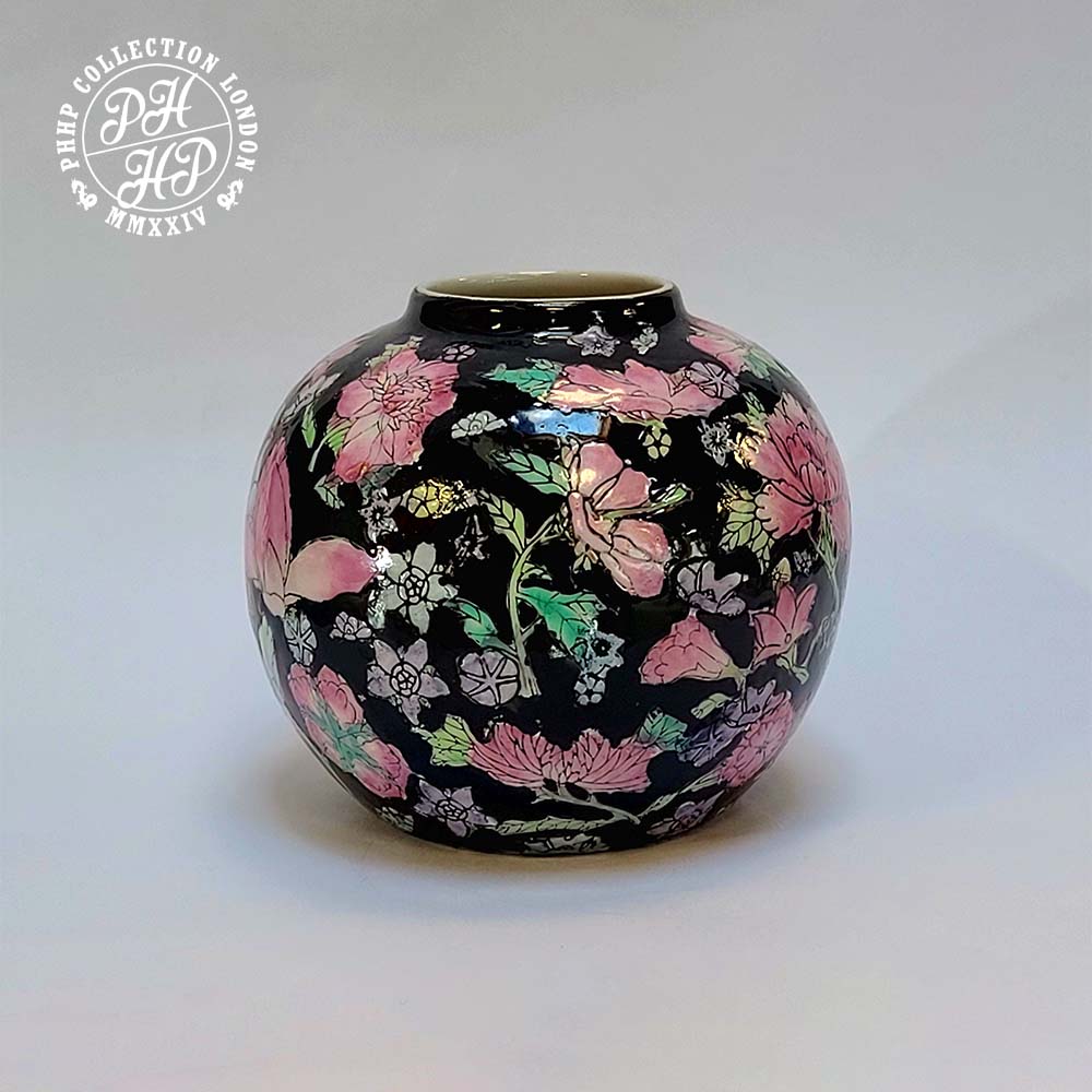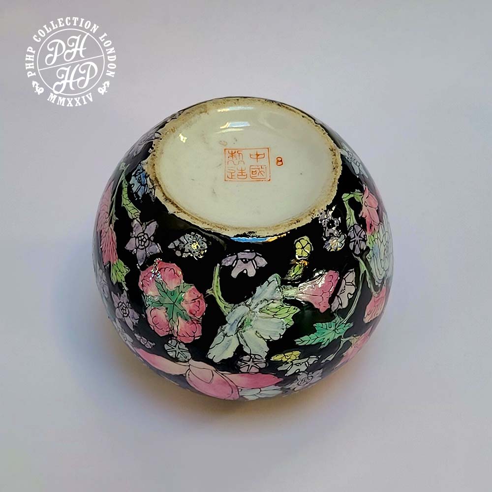This exclusivity of Coisnette is hand painted with pink and green enamel above black. It is unique design and pattern as was popular during the Ming dynasty. It is collectible piece for collectors. Rare and antique piece.