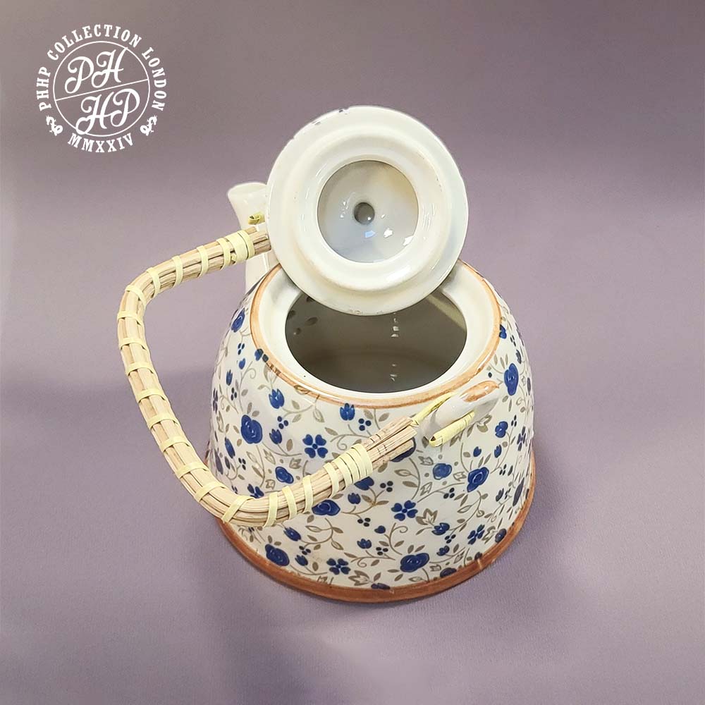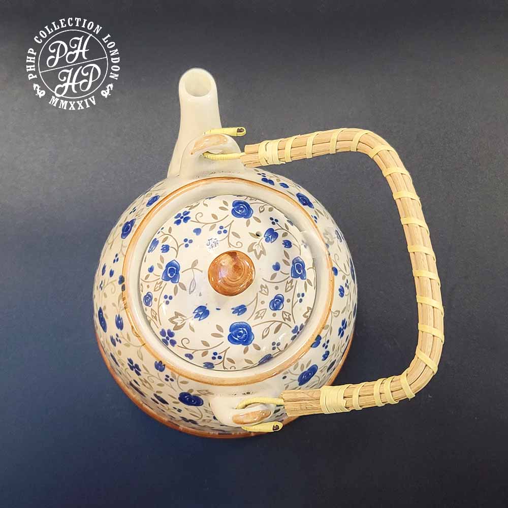 This exceptional preserved porcelain tea pot in monochrome in blue and white cobalt in underglaze, while brown painting heralds the experimental methods of producing porcelains. The handle is bamboo wrapped. In excellent and rare, ideal for collectors or museums.
