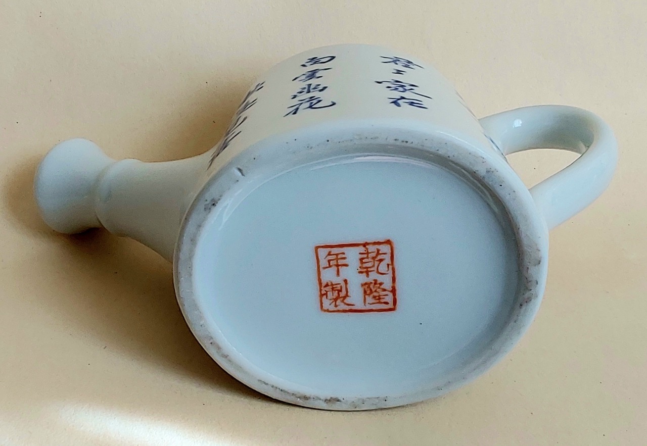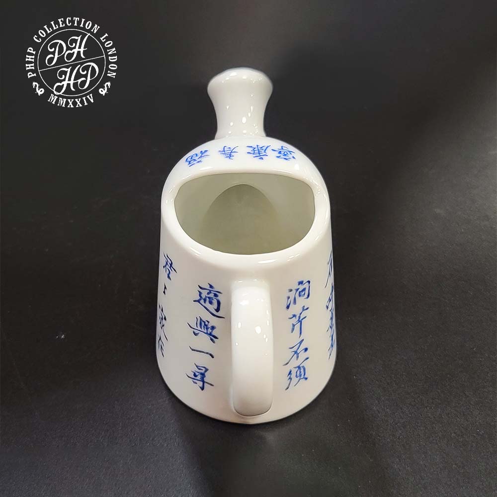 This Tea Pot is produced in a hand written cobalt blue under glazed poetry writing calligraphy for the imperial appreciation. All characters on this master piece porcelain are hand written to display, preserve and transfer, as it depicts the finest quality calligraphy by an unknown master painter serving personally in the direct supervision of the heads such as Emperor and his key people at the imperial courts.