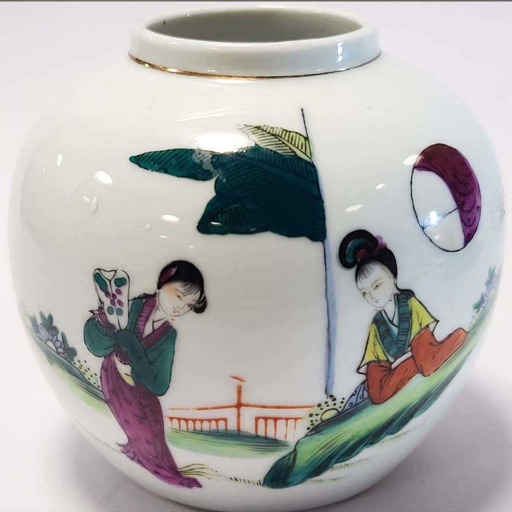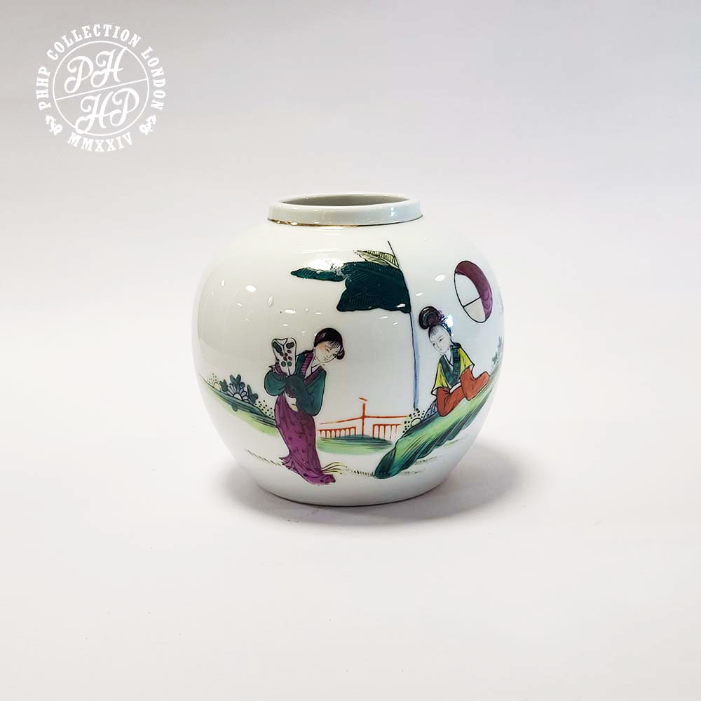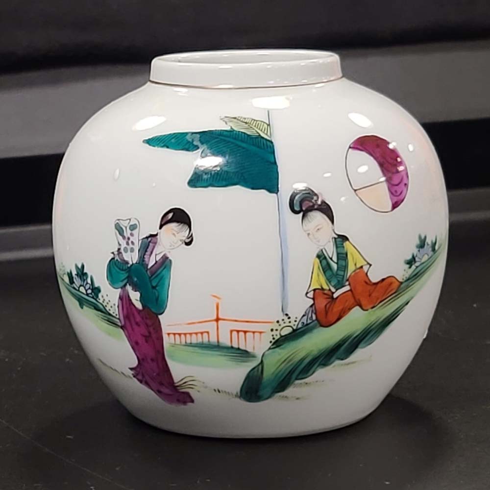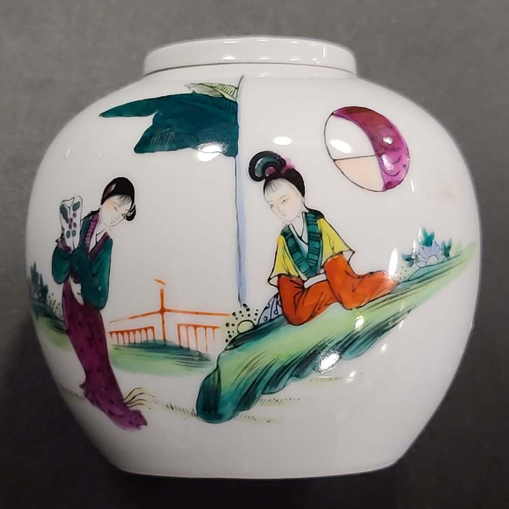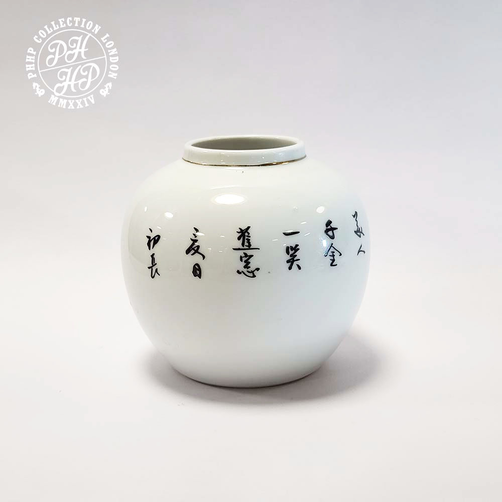 This late Qianglong period Family Verte jar with traditional characters inscriptions tell the story of well wishing messages of the two highly respected princess or daughters of the traditional aristocratic family. The traditional Chinese society expected them to show good characters and behaviors as in family, relatives as well as larger society. The scripts in black colour is written in traditional calligraphy tells the viewer to 'Smile' or 'Be Happy' so that to make others 'Smile' or 'Happy', by being around them. This porcelain is painted in coloured enamel of red, black and green in family verte style. It is truly rare in its kind. Ideal for the museums or collectors.