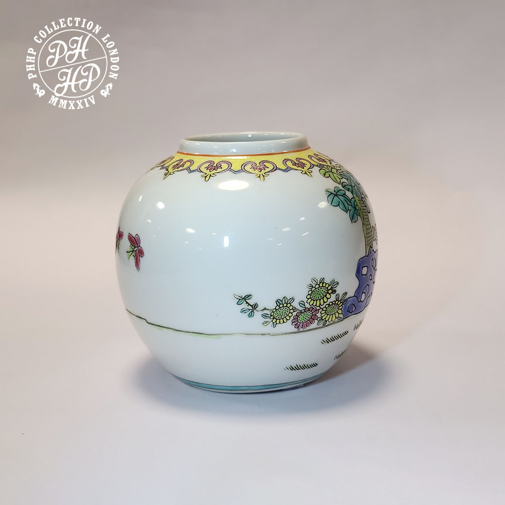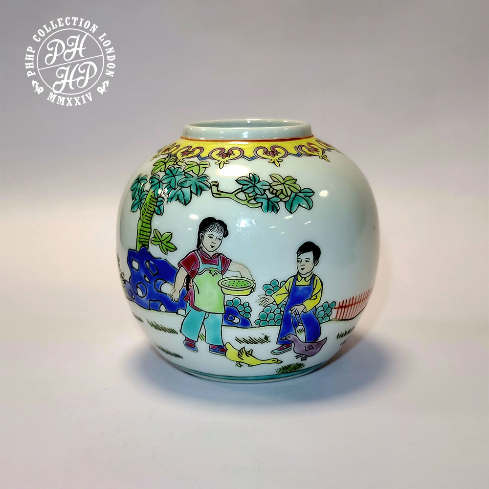 This beautiful jar without lead is a perfect example of Famille Rose, Chinese porcelain finished in multi colour such as green, red, black and yellow in underglaze and over glaze high quality porcelain production of the era during the Tongzhi emperor of mid to late Quing dynasty, imperial China. A perfect piece for the collector or museum coveting the rarity in Chinese porcelains of antiquity.