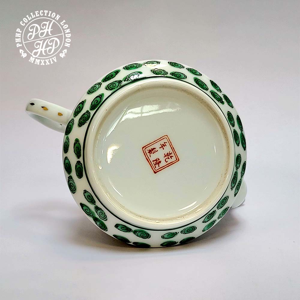 Official ware used for the Imperial household. Due to its high standard both in porcelain firing and the hand drawn green back and red spots with gold gilds and the calligraphy of Emperor Qianglong reign mark on the foot rim itself proves its authenticity. The gold gilds on green and black under glazed high quality porcelain shows the excellent quality of the hand drawn brush strokes in its decoration all over.