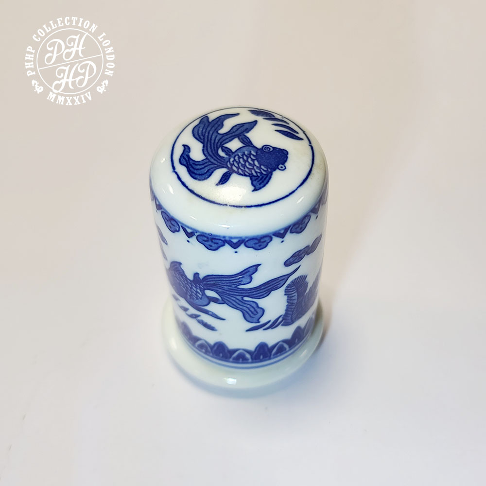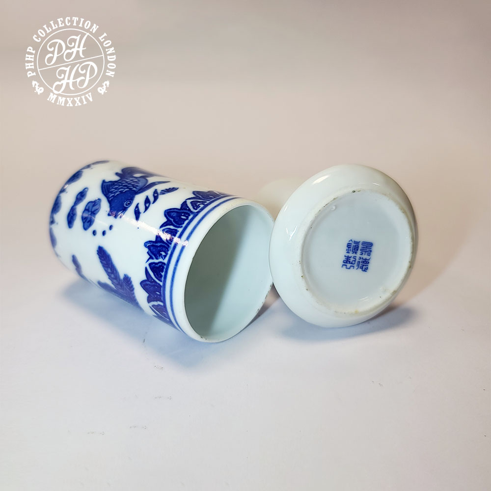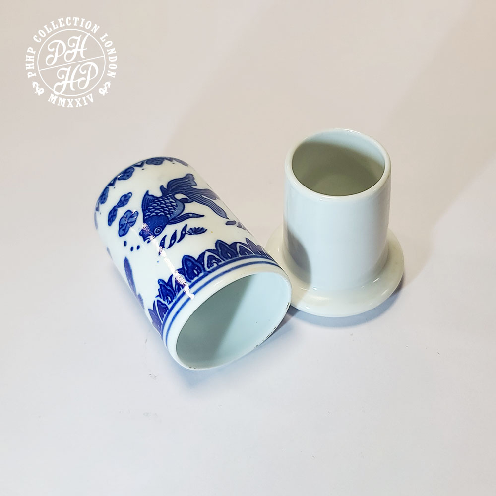 This gold fish blue and white porcelain has a distinct feature of quality hand drawing/painting in cobalt blue in underglaze. The feisty GOLD FISH looks to be swimming in the fresh water actively looking for food. Although in single colour paint, the dynamism of fish is three-dimensional in its posture and is an exceptional quality porcelain painting on cobalt of Ming period China, with a typical foot prints of a wall of gates in ornate standing. The jar resembles the characteristics of the Western Salt & Paper jar, but it is not so in case of this porcelain jar. Suitable for museum collection or private collector who would like to preserve the rare piece of blue & white porcelain in cobalt blue underglaze.