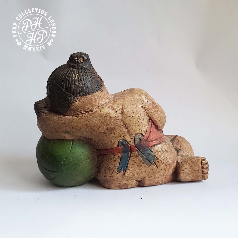 Sumo wrestlers were believed to have been originated in Japan during the Nara period (CE 710-794) and has become an essential part Japanese culture. They are also known as Rikishi in Japan. Its history is veiled in mystery and legends. Sumo wrestlers retire in age 30. Their life span is of 60 to 65 years old. They suffer from strokes, diabetes, heart, bone and joint problems. Sumo wrestlers might eat up to 10,000 calories a day. They are attracted by the athleticism, pageantry and traditions of this most Japanese of sports. This piece of Sumo wrestler carved in wood is 17th century work of art most probably produced in honour of one famous who were hailed hero within the sports at his time. Truly rare, treasure able.