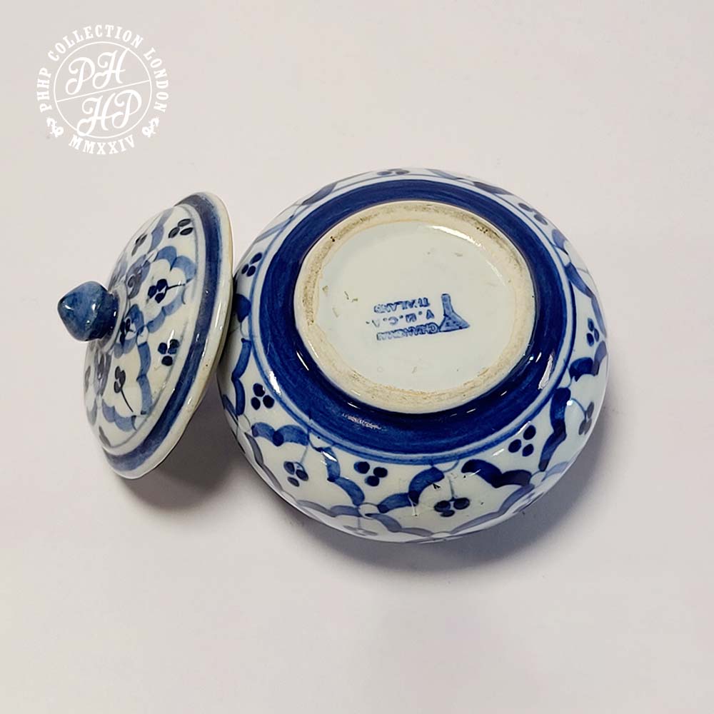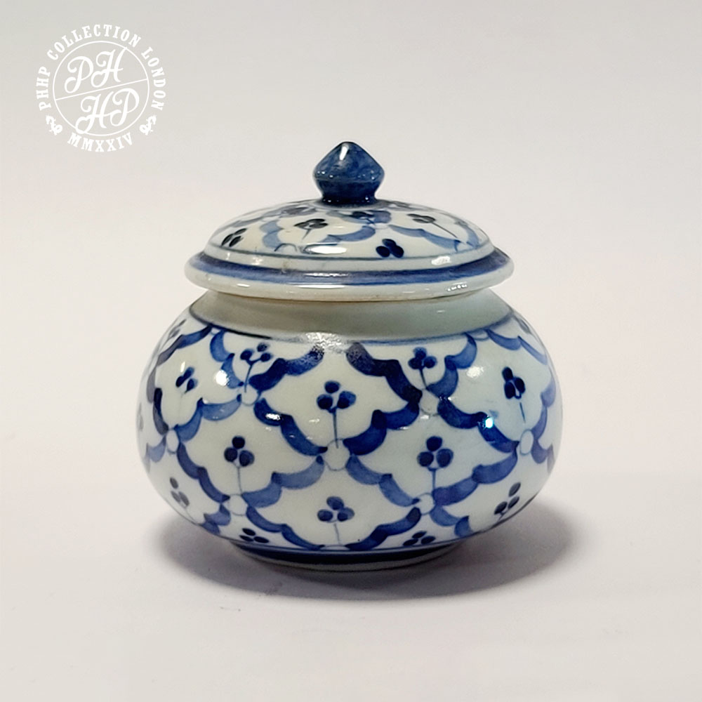 This jar is an example piece of high quality blue and white porcelain jar painted in cobalt turned blue in underglaze. Thai blue and white Porcelains in Orchids in square shapes. Unlike the Chinese blue and white porcelains, Thai porcelains are rare and highly prized. Ideal for the collectors and museums for its rarity value.