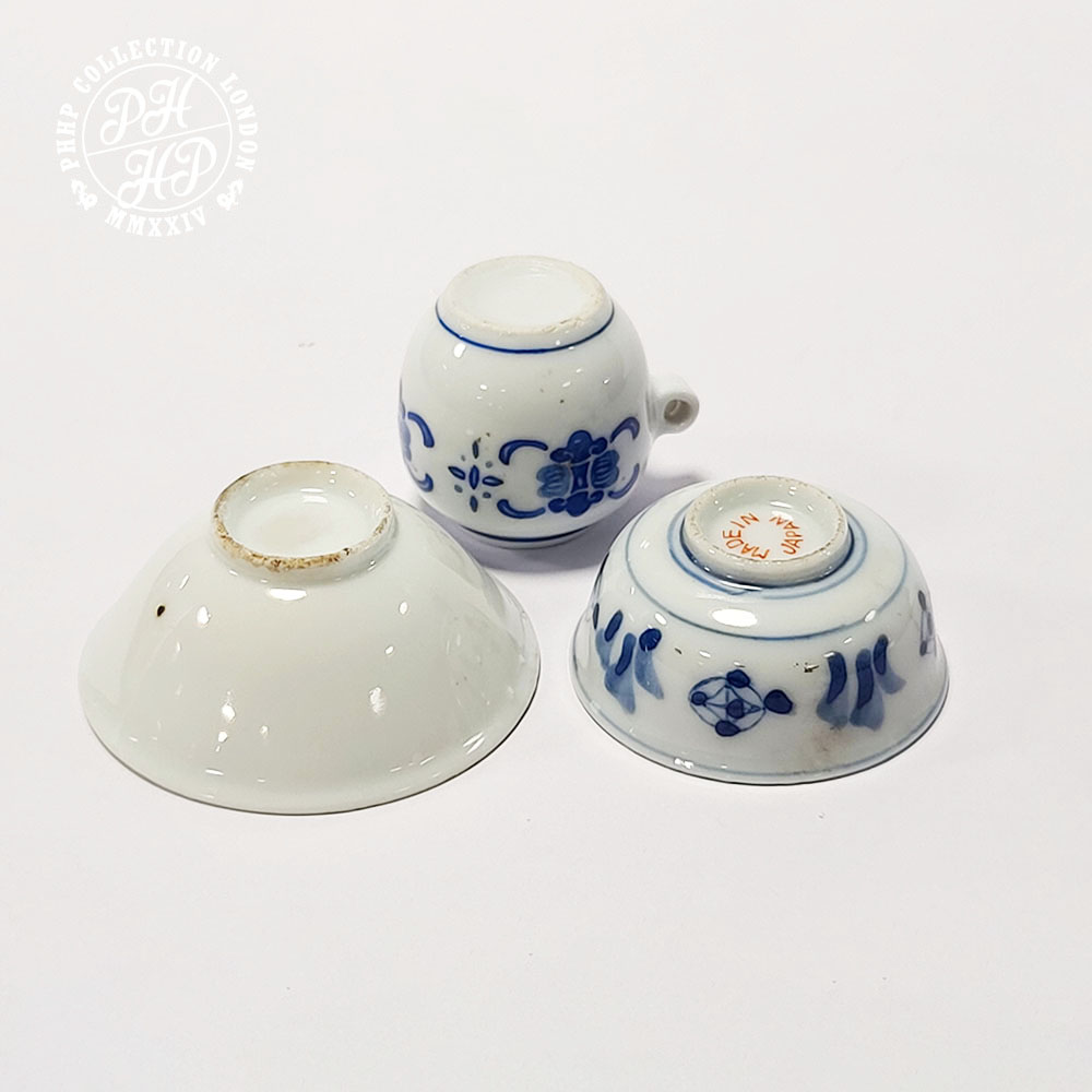 These Japanese items are all hand made, hand panted items of porcelains. One family verte bowl depicts green, black Arita feature, whist 24 crt gold plated bowl has a distinct blue and white cobalt blue in underglaze and other tiny jar is in cobalt blue in underglaze plate. These tiny pieces were probably produced for the purpose of offering them in the shrine of Buddhist temple or worshiping shrine as a gesture gift to the divine.